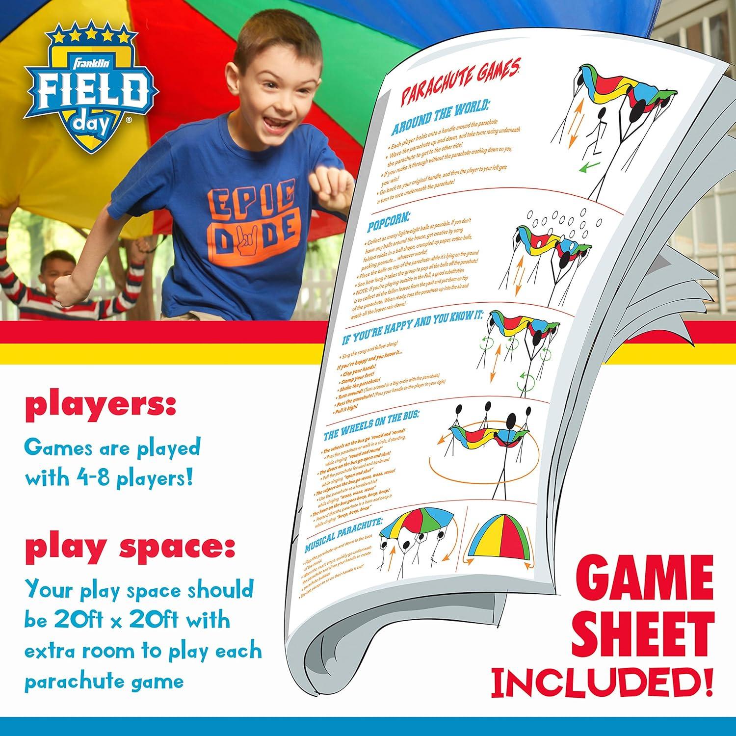 Check out this HUGE 10ft parachute! Game sheet included to show a few ways to play… try one out or create a game of your own! The 10ft Franklin Sports Popcorn Parachute is perfect for backyard events like birthdays, cookouts, community events, and more! The parachute features vibrant colors and handles along the edges to allow children to easily grip and play along. The game sheet includes FIVE ways to play, but don't stop there! With a popcorn parachute, the possibilities are endless!