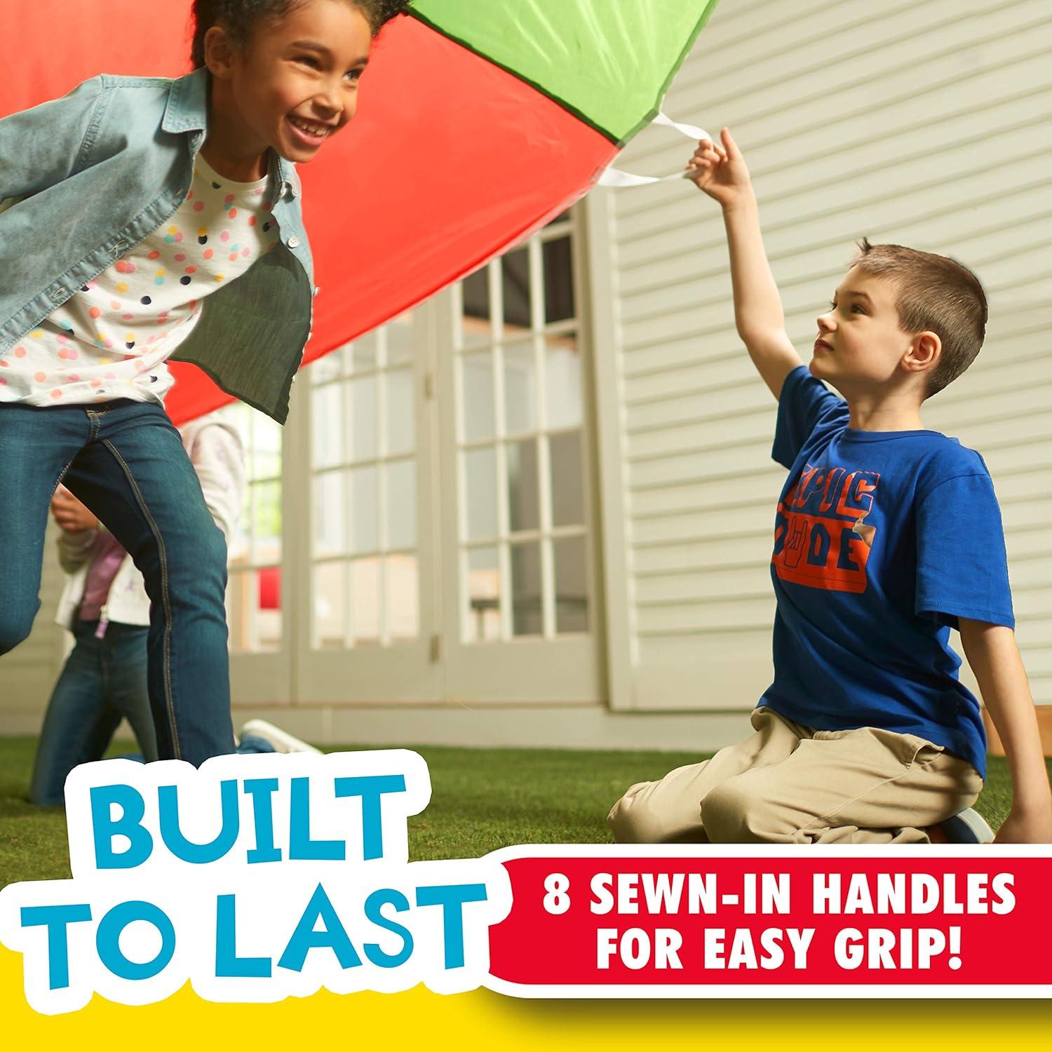 8 HANDLES INCLUDED, The parachute features 8 handles around the perimeter to allow children to easily grip and play along with friends and family