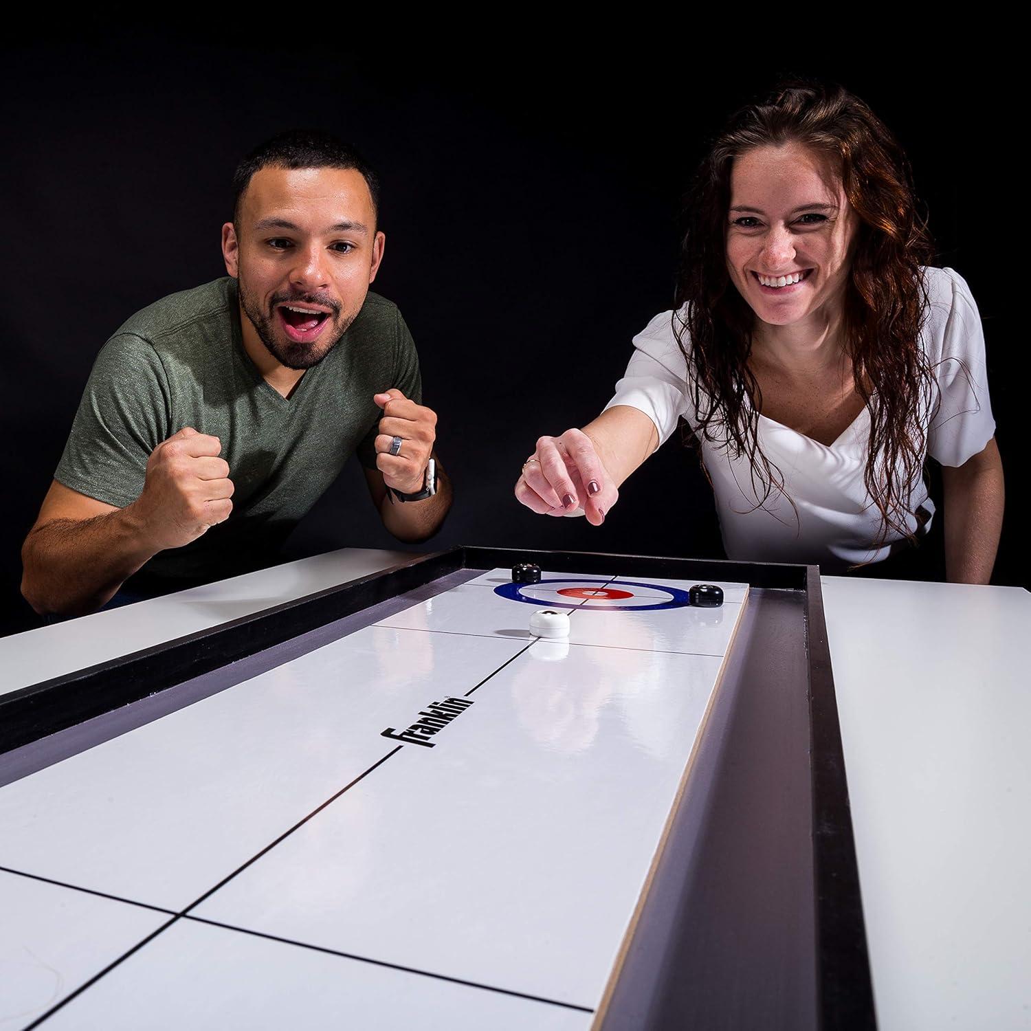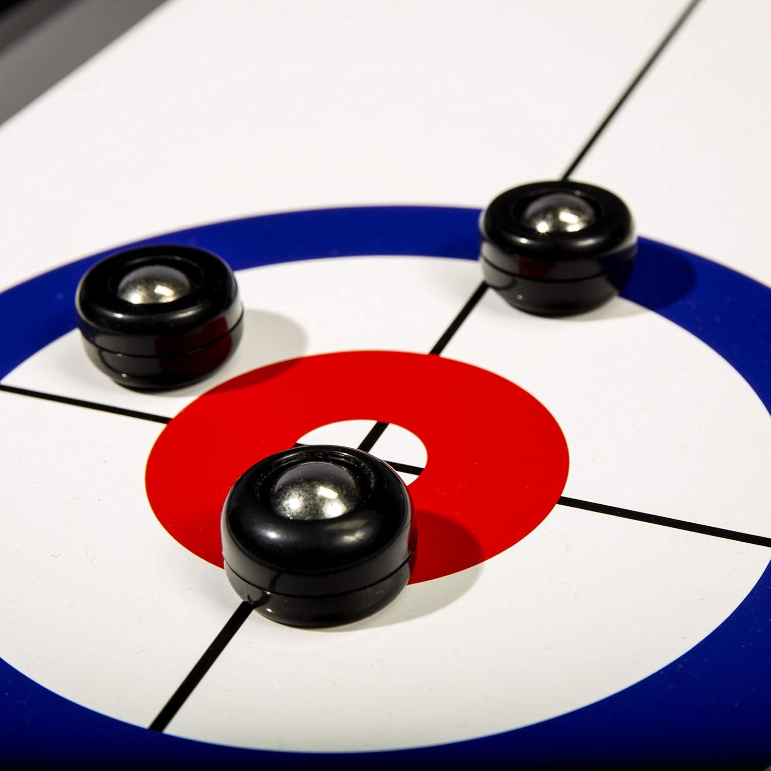 DOUBLE THE FUN: This 2-in-1 tabletop set is designed to bring more fun by offering shuffleboard on one side and curling on the other.