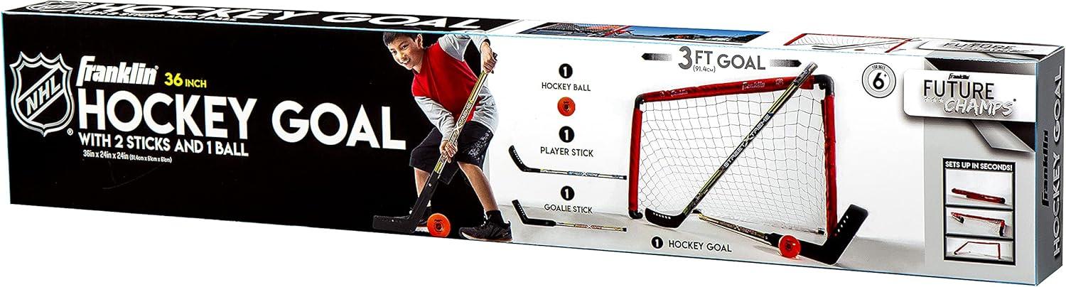 Teach your kids, nieces or nephews the fundamentals of Hockey at an early age with the Franklin Sports NHL Goal & 2 Stick Set. Whether you're playing indoors or outdoors, this durable goal remains upright on a number of surfaces from carpet to gravel. The set includes 1 goalie stick, 1 player stick and a Hockey ball, all combining to help turn your basement into an offensive end that's perfect for shootout competitions between friends and family. Set includes 1 INSTA-SET Hockey goal with sleeve net, (1) 34″ goalie stick, (1) 34″ player stick and a 70mm Hockey ball No assembly required For ages 6 and up.