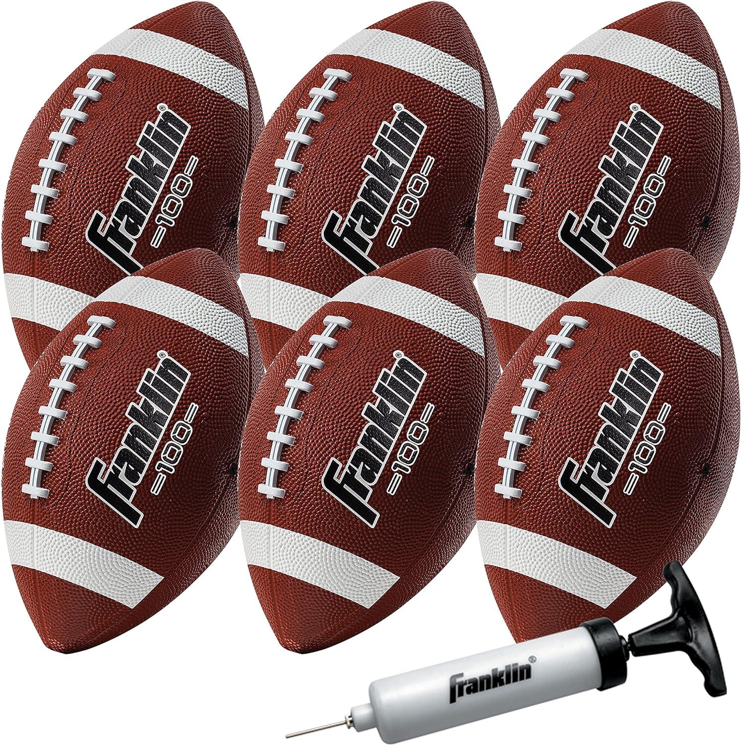 Franklin Sports' Grip Rite 100 Junior Footballs are the perfect footballs for kids to toss around in the playground, at the park, on the beach or anywhere else the game takes them! These junior sized footballs are designed for younger players to be able to throw and catch with ease. The dimensions are official junior size 10″ long by 6″ wide which make these footballs perfect for kids. The deep-pebbled rubber surface makes these footballs easy to grip for better throws and catches. Plus, the pro style raised laces make it easy for smaller hands to control and toss the ball for accurate spirals. The ultra-durable rubber construction ensures that you can use this ball on grass, sand or concrete without having to worry about tearing or damage. These footballs are available for individual purchase or in team packs of (6) that come with an inflation pump included. So grab your Grip Rite 100 Junior Football and get the game started today!