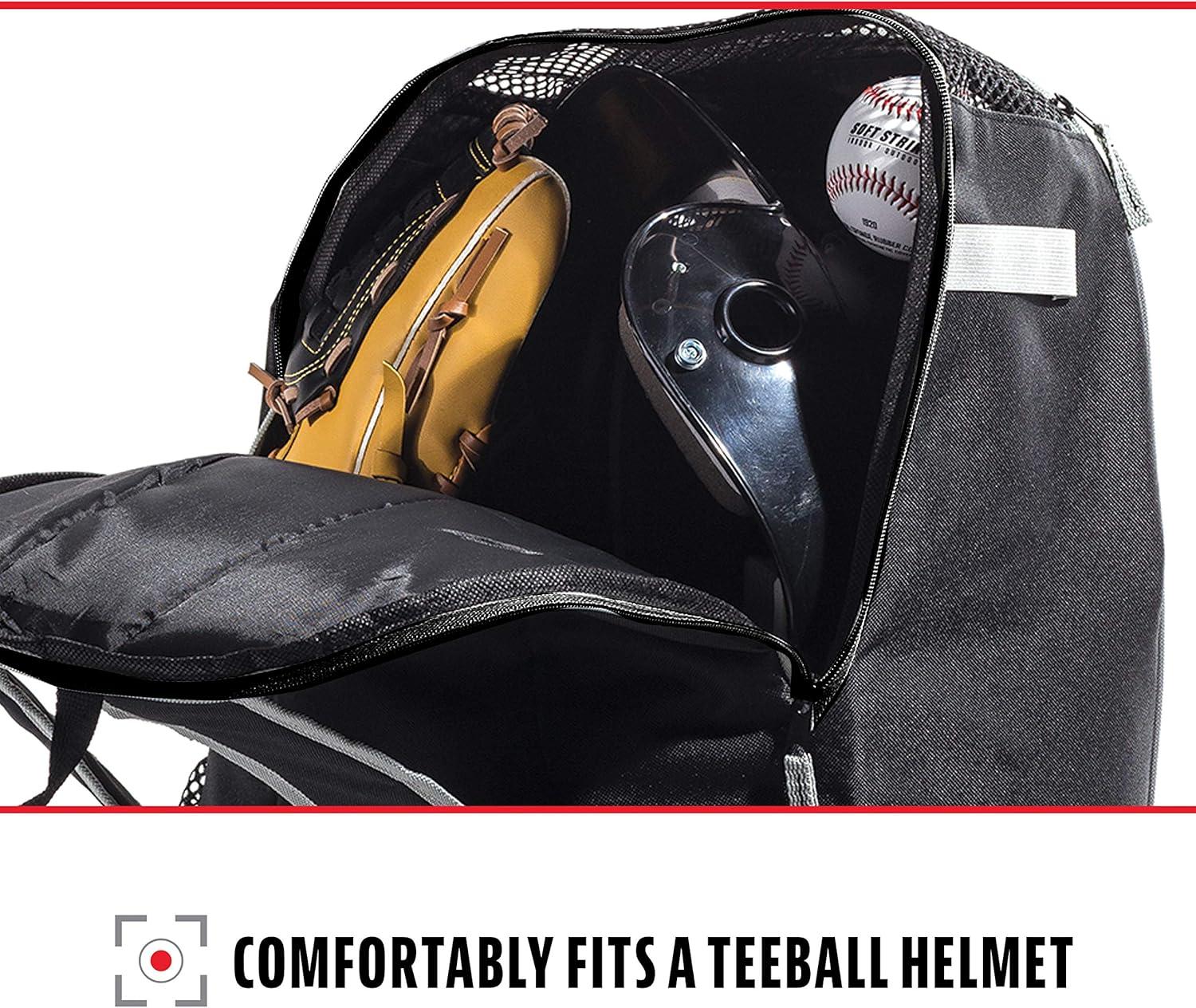 LARGE STORAGE COMPARTMENT: Spacious main compartment holds baseball helmet with face mask, batting gloves, fielding glove, cleats, and various accessories