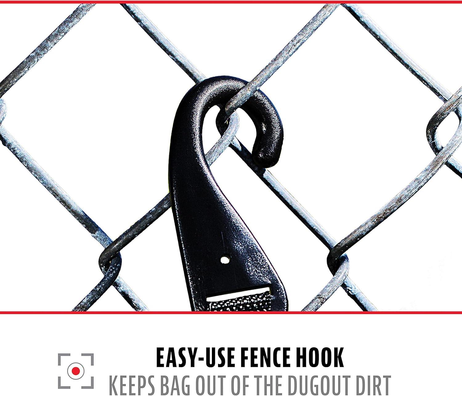 EASY-USE FENCE HOOK: Convenient j-style hook allows bag to hang on dugout fence for easy accessibility