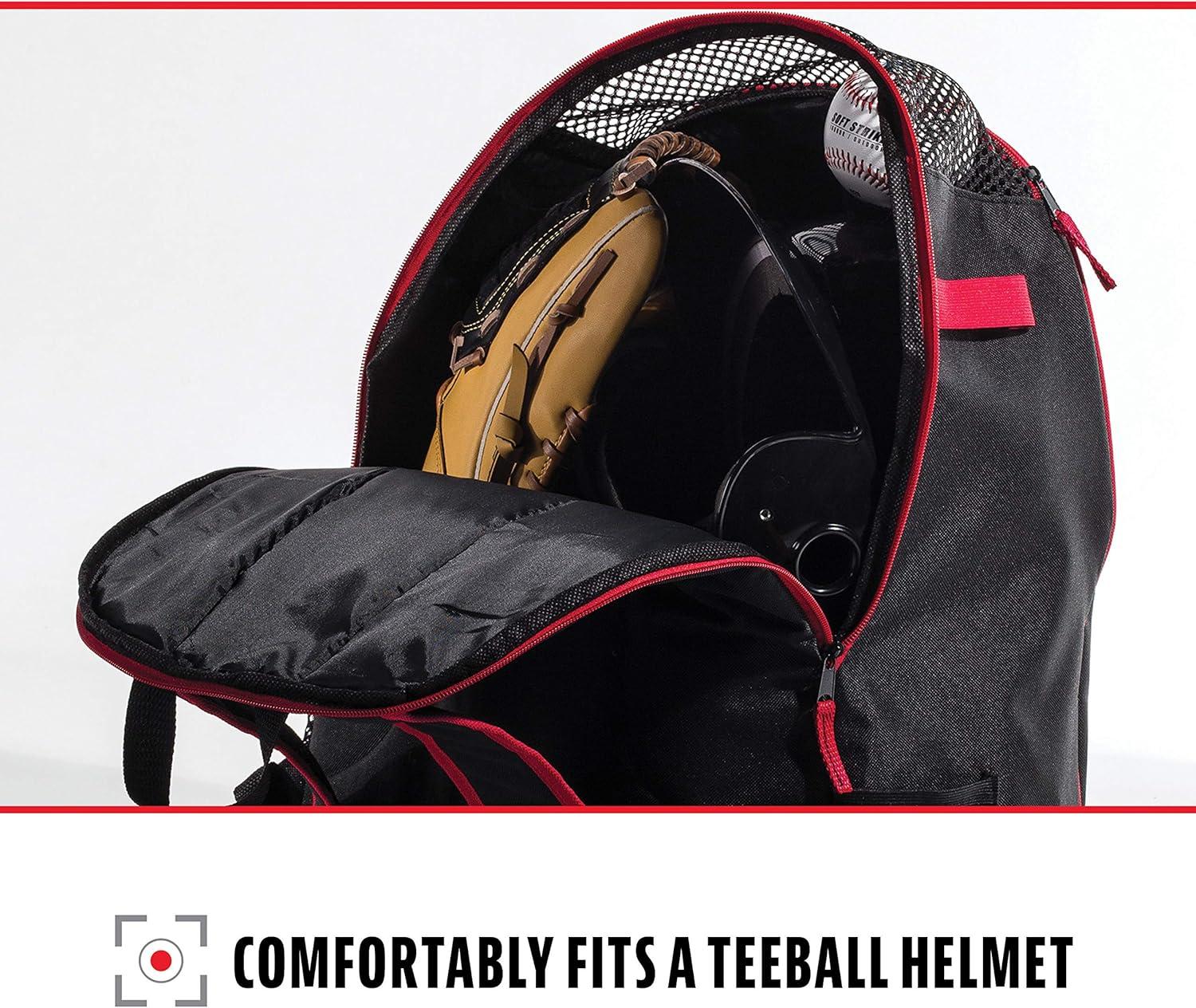 LARGE STORAGE COMPARTMENT: Spacious main compartment holds baseball helmet with face mask, batting gloves, fielding glove, cleats, and various accessories