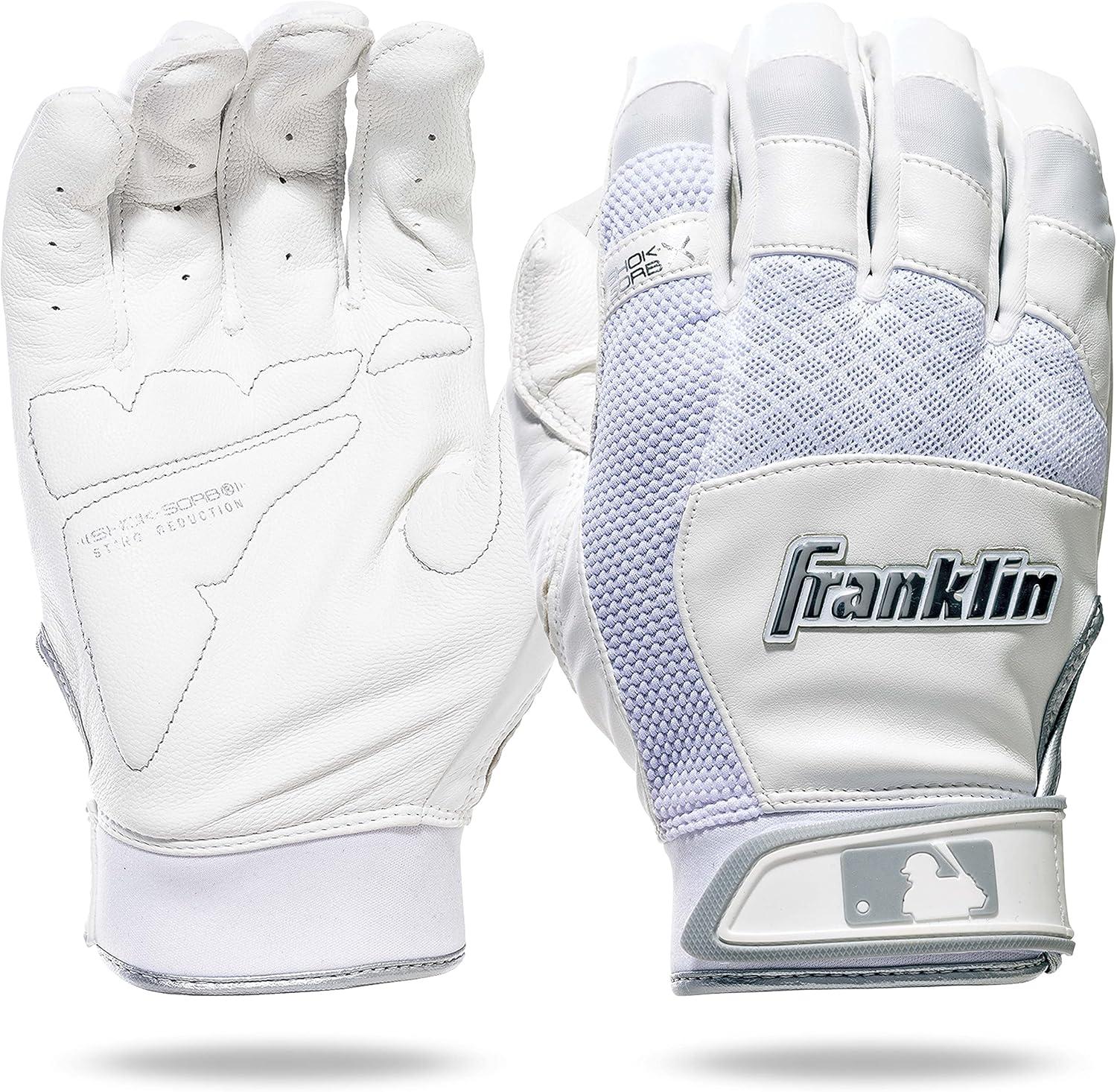 Franklin Sports MLB Baseball Batting Gloves – Shok-Sorb X Batting Gloves for Baseball + Softball – Adult + Youth Padded Non-Sting Batting Glove Pairs – Multiple Colors + Sizes(White/Chrome)