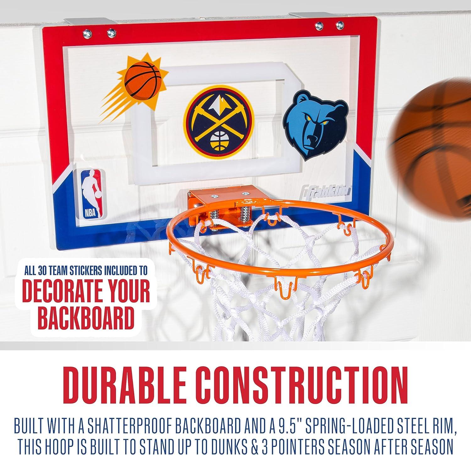 Franklin Sports NBA Over The Door Mini Basketball Hoop – Kids Custom NBA Team Indoor Mini Hoop with All 30 Team Stickers – Fan Shop Basket for Bedroom + Office