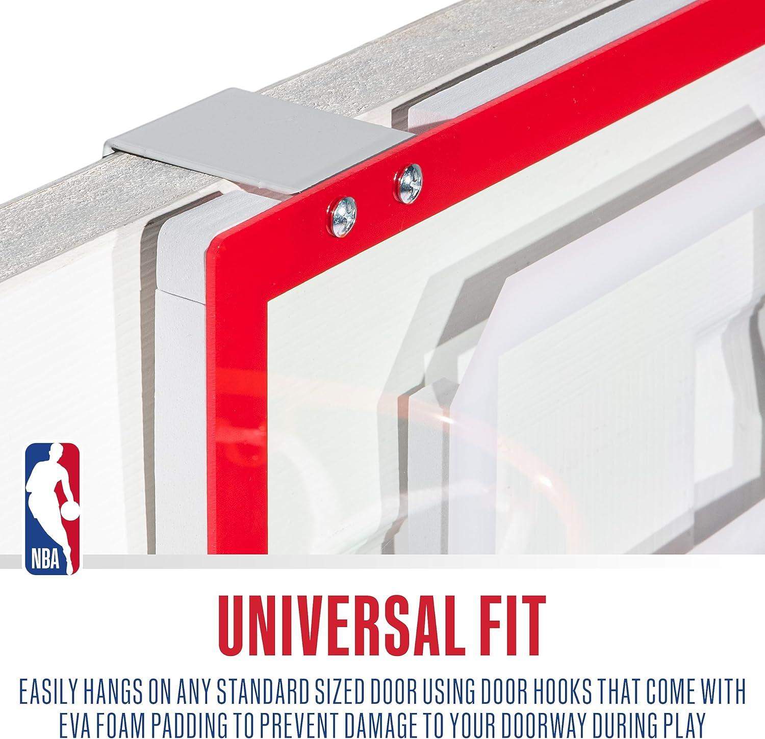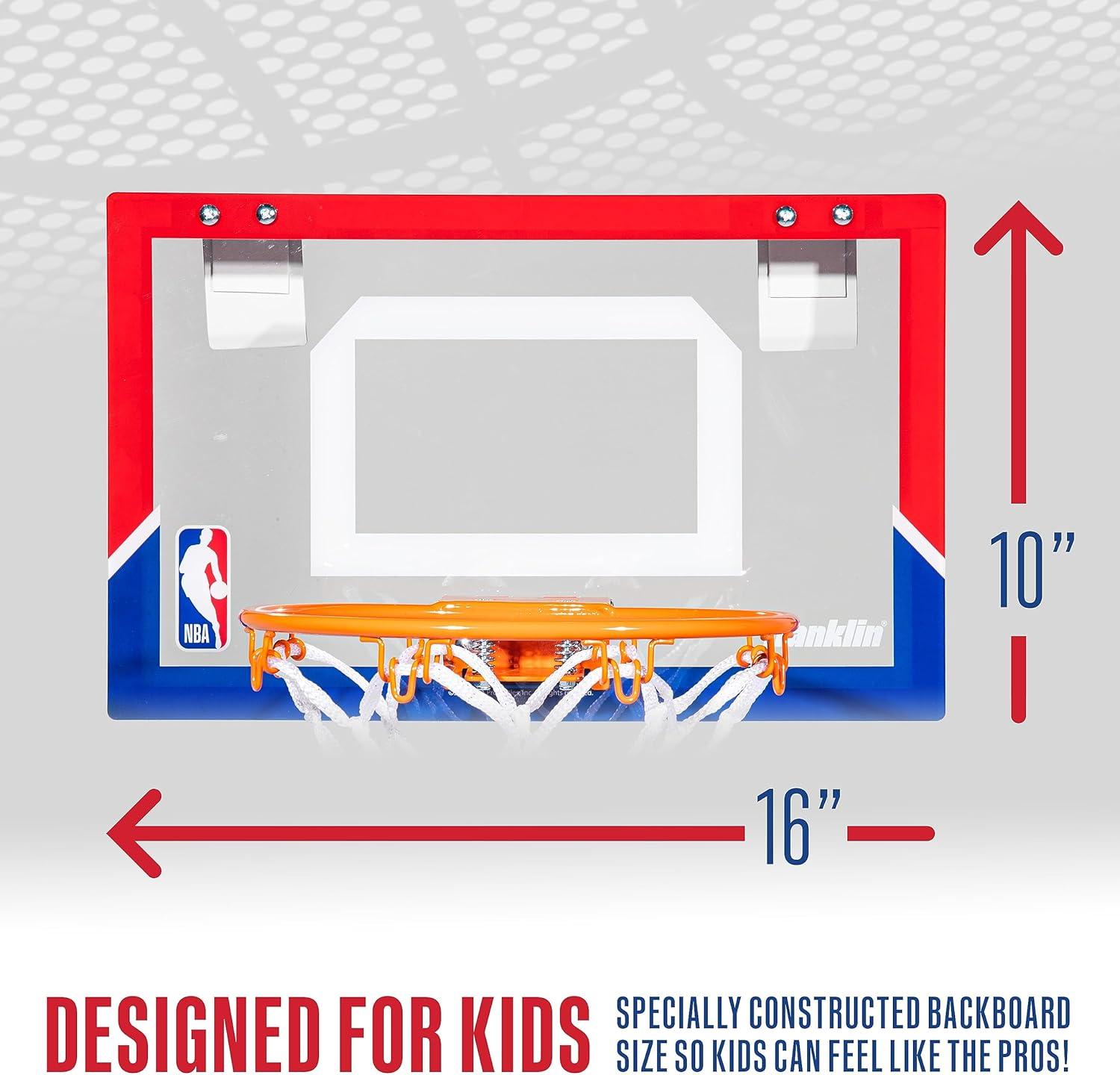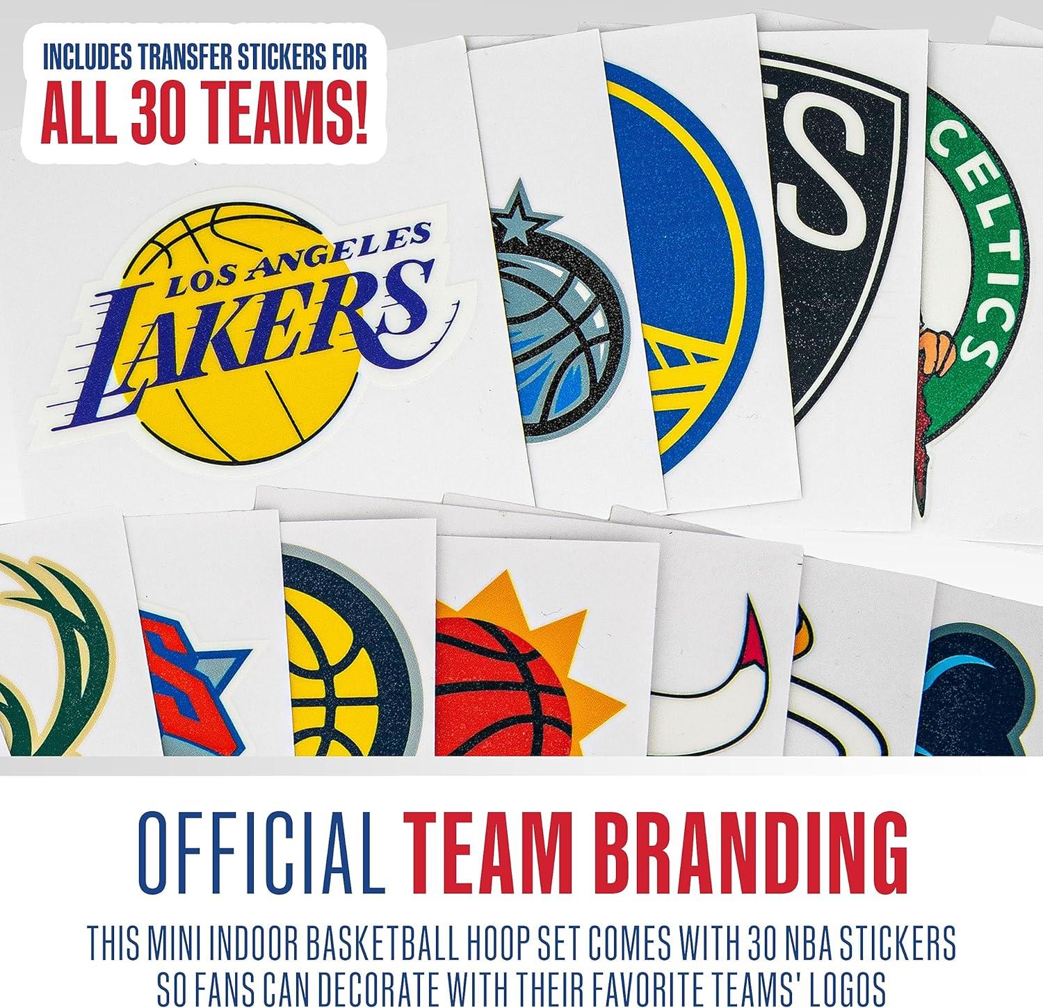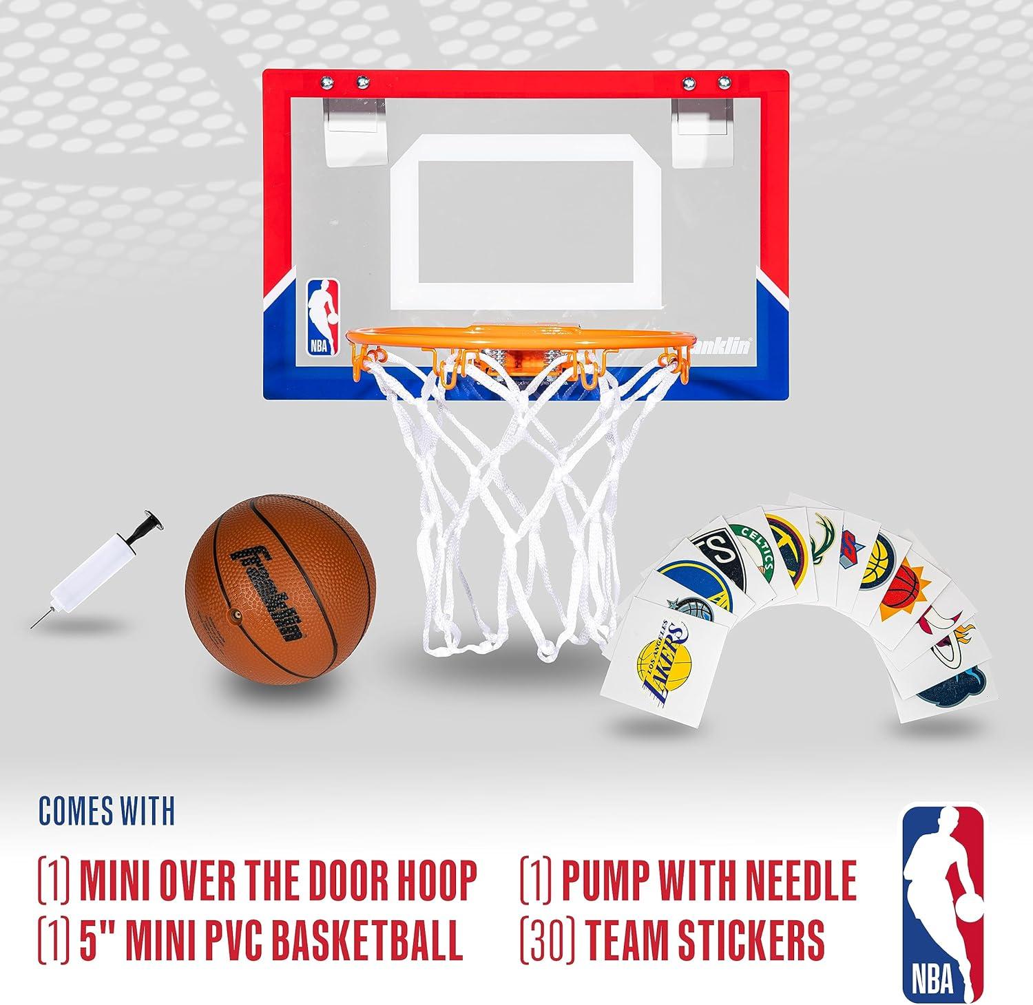 Bring all the fun of NBA basketball inside with Franklin Sports' NBA All-Team Kids Over the Door Basketball Hoop Sets! Complete with 30 premium 3.5″W stickers for all NBA teams, these mini basketball hoop sets are the perfect way for young fans to play and feel like their favorite basketball stars. This kids mini hoop is super easy to assemble and is designed to fit on any sized door. Plus, the mini hoop hooks are constructed with a foam backing to prevent any damage to your doors during game play. Made with shatterproof backboards and a 9.5″ inch spring-loaded steel rim, these indoor mini hoops are designed for premium, durable performance. These hoops are 3 pointer and slam dunk approved, so kids can practice all their favorite basketball skills. Kids will love getting to customize their over the door hoop with the 30 included 3.5″W NBA team stickers so they can show love for their favorite NBA teams. Each set comes with (1) NBA team over the door basketball hoop, (1) 5″ mini basketball, (30) NBA team logo stickers, and (1) air pump included, so kids have everything they need to play right out of the box. So if you're looking for the perfect gift for the young basketball fan in your life, look no further and grab your Franklin Sports NBA All-Team Kids Over the Door Basketball Hoop Set today!