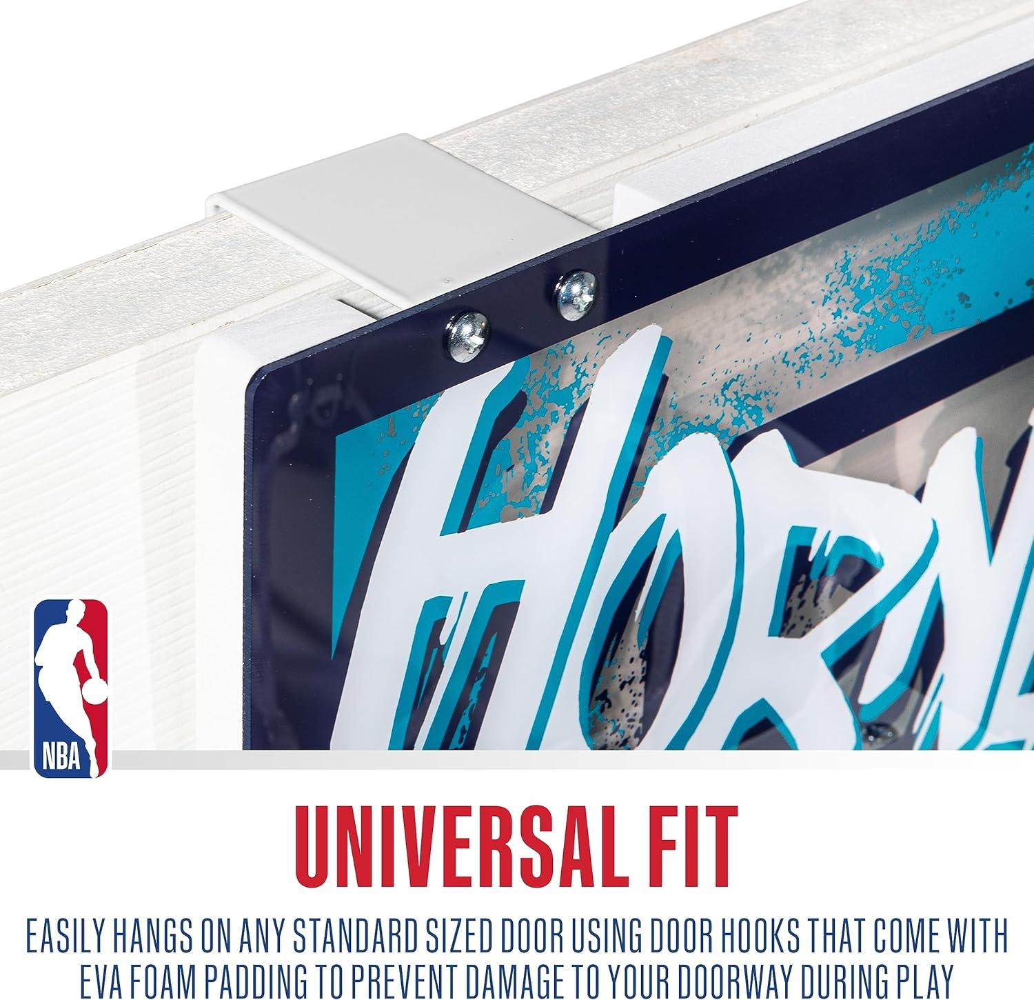 FULL SET INCLUDED: This NBA set comes complete with (1) over the door hoop, (1) 5″ mini basketball, and (1) air pump so you have everything you need to get the game started!