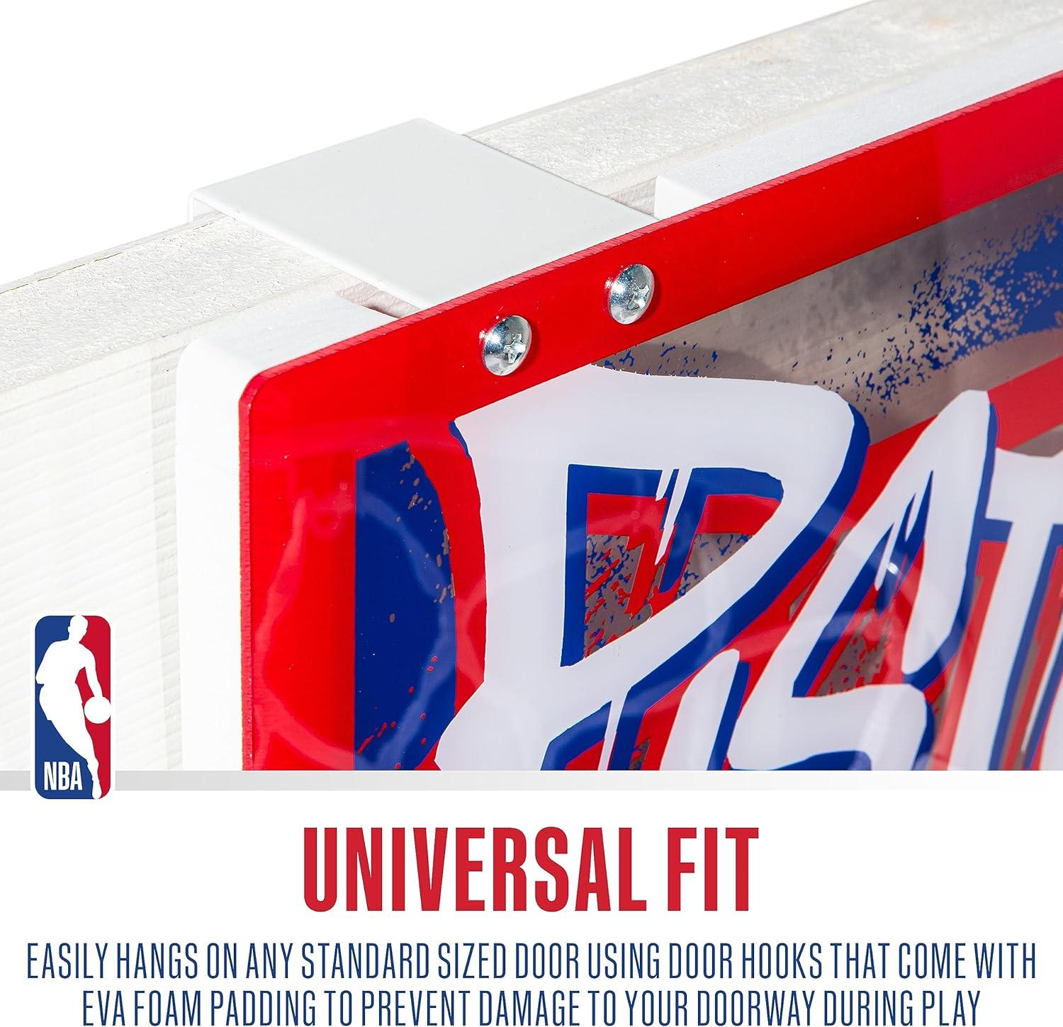 FULL SET INCLUDED: This NBA set comes complete with (1) over the door hoop, (1) 5″ mini basketball, and (1) air pump so you have everything you need to get the game started!