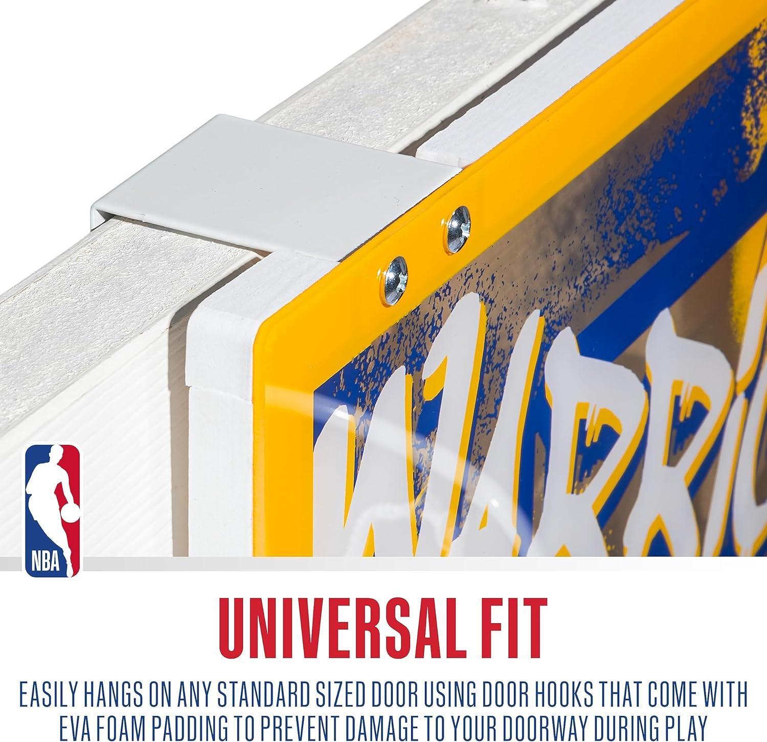 FULL SET INCLUDED: This NBA set comes complete with (1) over the door hoop, (1) 5″ mini basketball, and (1) air pump so you have everything you need to get the game started!