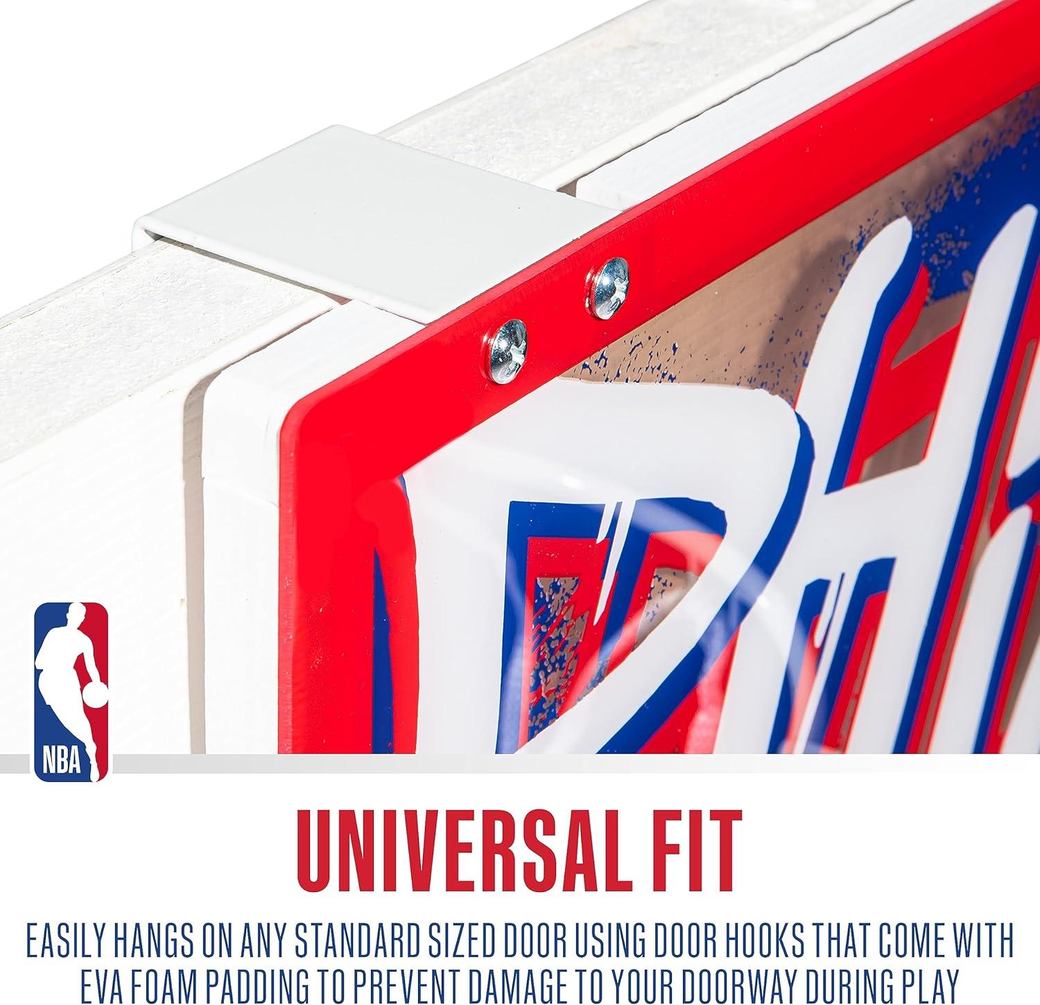 FULL SET INCLUDED: This NBA set comes complete with (1) over the door hoop, (1) 5″ mini basketball, and (1) air pump so you have everything you need to get the game started!
