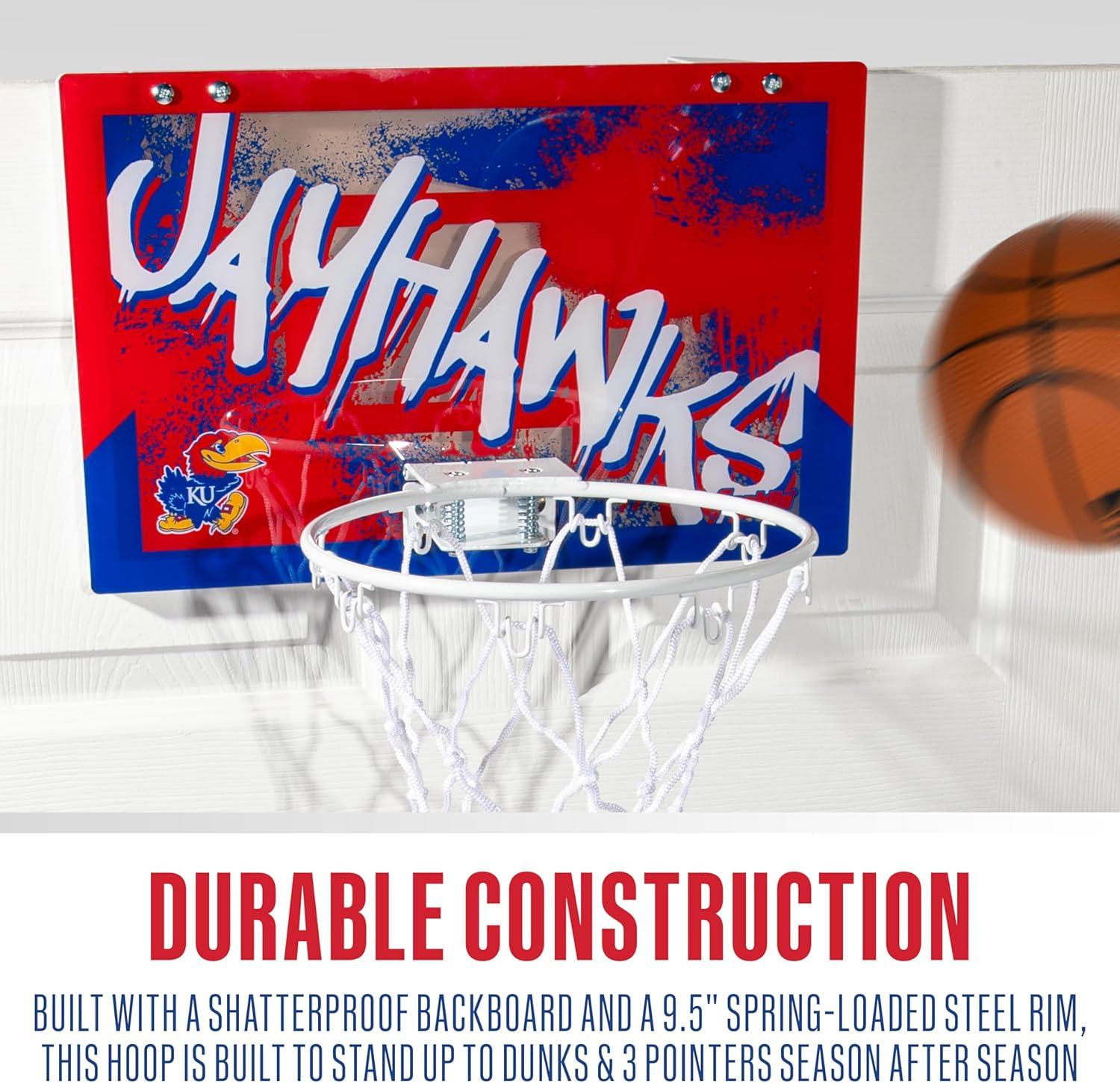 KANSAS BASKETBALL HOOP: This official over the door basketball hoop set is the perfect way for kids to bring the game indoors and show some love for their favorite school