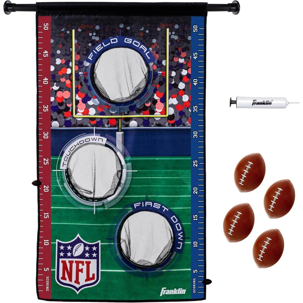 Take your position as quarterback and compete for the most points with the Franklin Sports NFL Door Jam Football Target Toss Game Set! Split up into teams or play solo with a football target that mimics traditional football gameplay! Aim for the touchdown to score big, or bag a first down and get 4 more throws. The passing target features built-in 2-player scoring so that you can keep track of your points as you complete each pass. This 3-hole target is perfect for kids to practice throwing and taking their offensive skills to the next level! This kids target toss game set comes complete with (1) 3-hole, over-the-door passing target and (4) 6″ mini footballs included so you have Split up into teams and compete against your friends and family! Aim for the most points to prove which team is the NFL Champion!