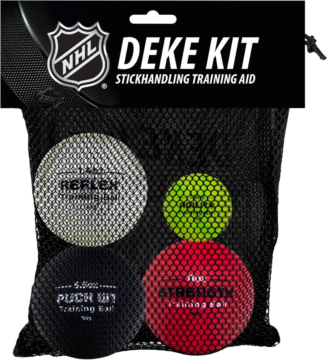 Franklin Sports NHL Hockey Stick Handling Training Ball set is the perfect training aid to help all hockey players improve their handle both on and off the ice! This (4) ball training set helps players practice a variety of stick handling skills so they can improve their deke and hands skills during games. The first hockey training ball is the Micro AGS mini hockey ball. The 38mm, 45g ball about the size of a ping pong ball and helps players train their hand-eye coordination and stick control skills for additional precision. The second training ball is the official puck weight hockey ball. The official puck weight hockey ball makes it easy for players to get used to the feel of a regulation puck while they train off-ice, so you can practice your stick handling anywhere you go. The third training ball is the 2x weighted hockey ball. The weighted hockey ball is double the weight of a standard puck and helps improve players' hand strength and quickness for when the return to gameplay with regulation pucks and balls. The final hockey training ball is the reflex training ball. Designed to be nearly transparent, the reflex ball allows players to rely on feel rather than vision as they train their hands to feel the ball on the blade of the stick while keeping their head up and staying aware of the ice. If you are looking to practice your stick handling skills and take your hockey game to the next level, grab yourself the Franklin Sports NHL Hockey Stick Handling Training Ball Set and start practicing today!