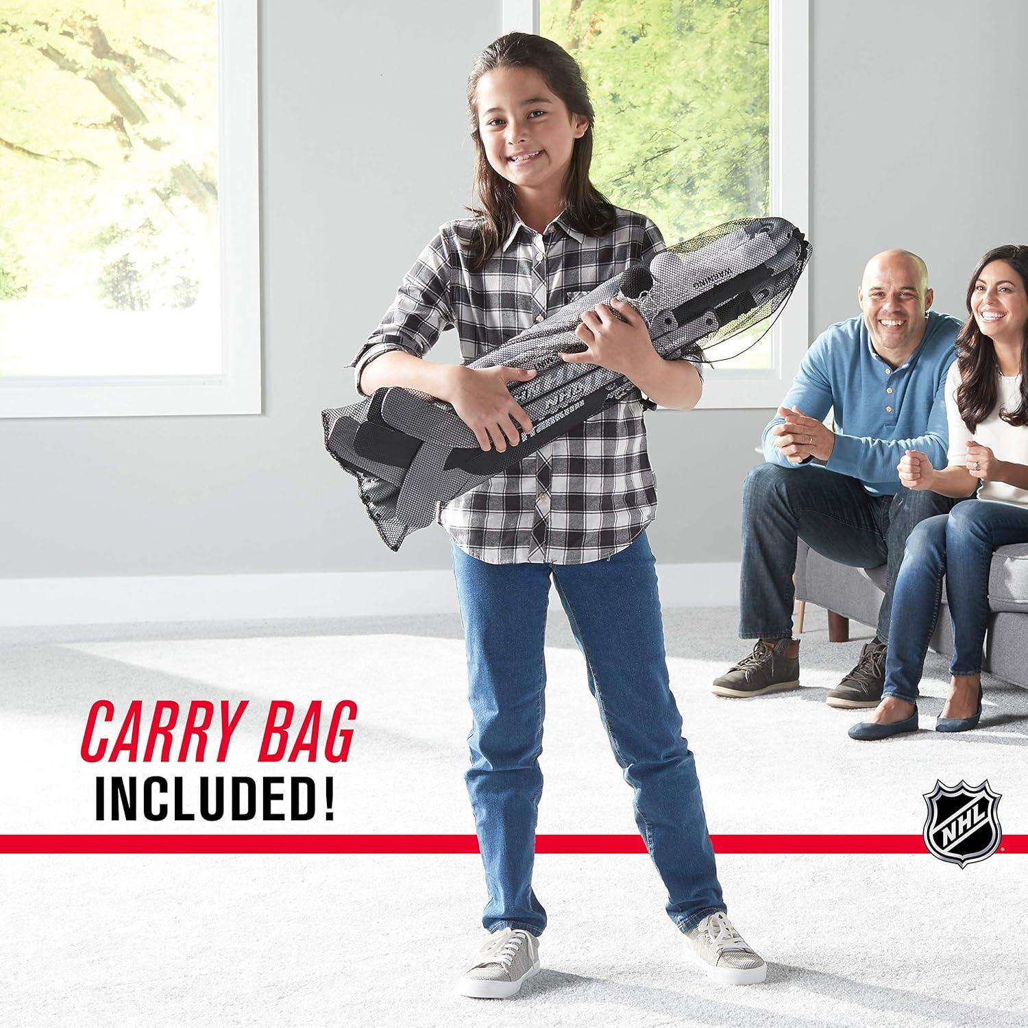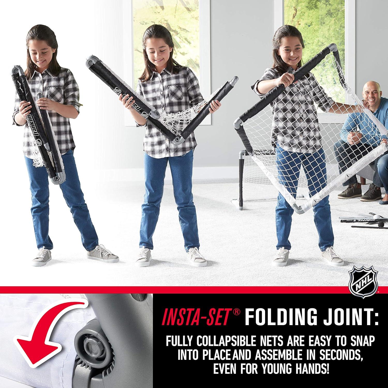 Introducing the ultimate hockey experience for your little ones the Franklin Sports NHL Kids Mini Hockey Goal Set. This awesome kids hockey set has everything your young champions need to dive into the fun world of knee hockey. With two mini hockey nets, four mini hockey sticks, 2 goalie sticks, and 4 foam balls, this knee hockey set is perfect for transforming your living room into a mini arena. This hockey set is not just about fun; it's a great way for your kids to practice their shooting and goalkeeping skills in a safe, indoor environment. This set encourages them to play on their knees, making it a fantastic solution for active play that doesn't result in broken lamps or slips. Unique features? You bet! The Franklin Sports set comes with both right and left-handed kids hockey sticks, so no one gets left out. Plus, the hockey nets are fully collapsible, making clean-up a breeze. Everything fits neatly into a slim carry bag, perfect for on-the-go fun or easy storage. And with durable plastic construction, this indoor hockey set is built to withstand all the competitive action your kids can dish out. This floor hockey set is safe and sturdy. Just set it up, and watch as your kids get lost in hours of fun with their new favorite hockey toys. Just a heads up, you’ll need to provide the excitement and cheers because this set is all about the gear. This hockey set includes 2 knee hockey nets, 4 mini hockey sticks, 2 hockey goalie sticks, and 4 foam balls.