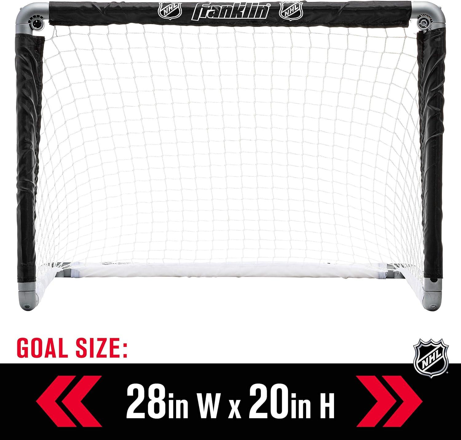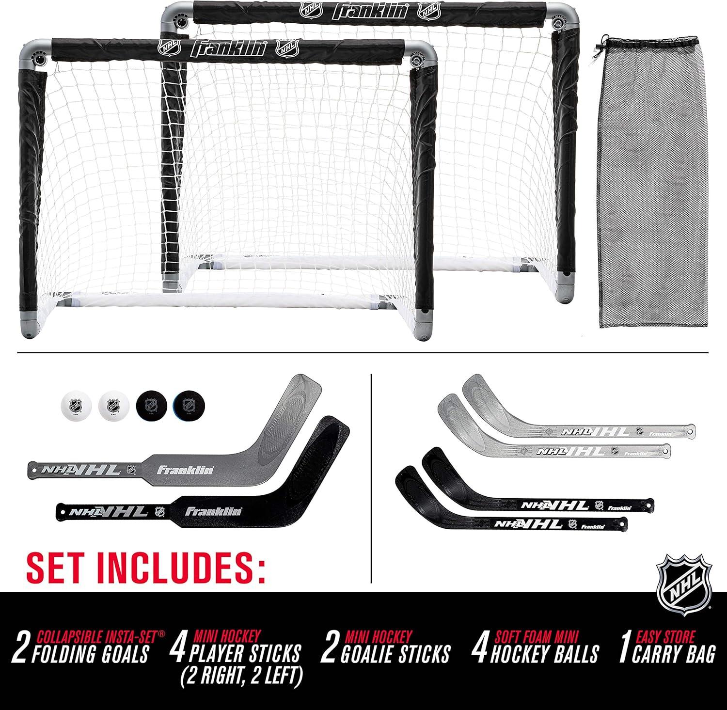 Franklin Sports NHL Kids Mini Hockey Goal Set – (2) Mini + Knee Hockey Goals, (4) Youth Sticks, (2) Goalie Sticks + (4) Foam Balls – Knee + Mini Hockey Set(Black)
