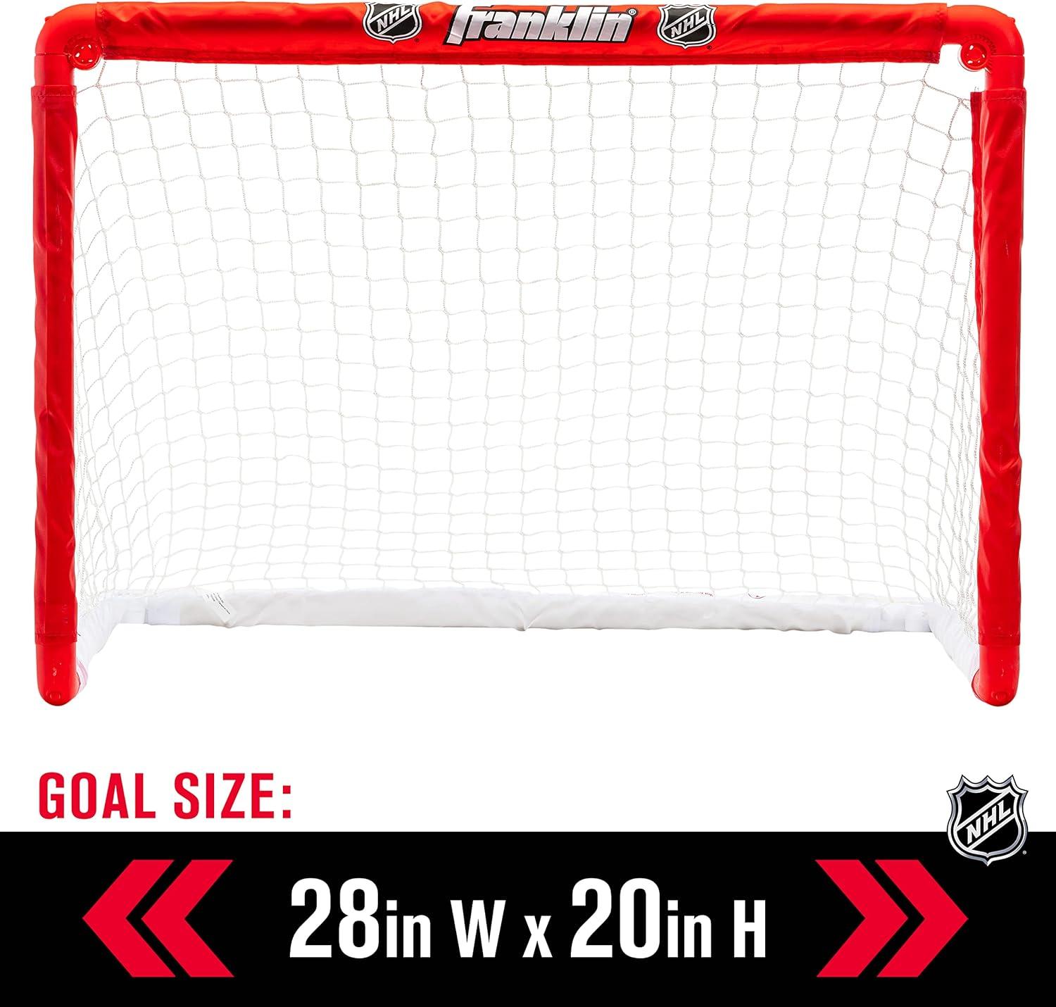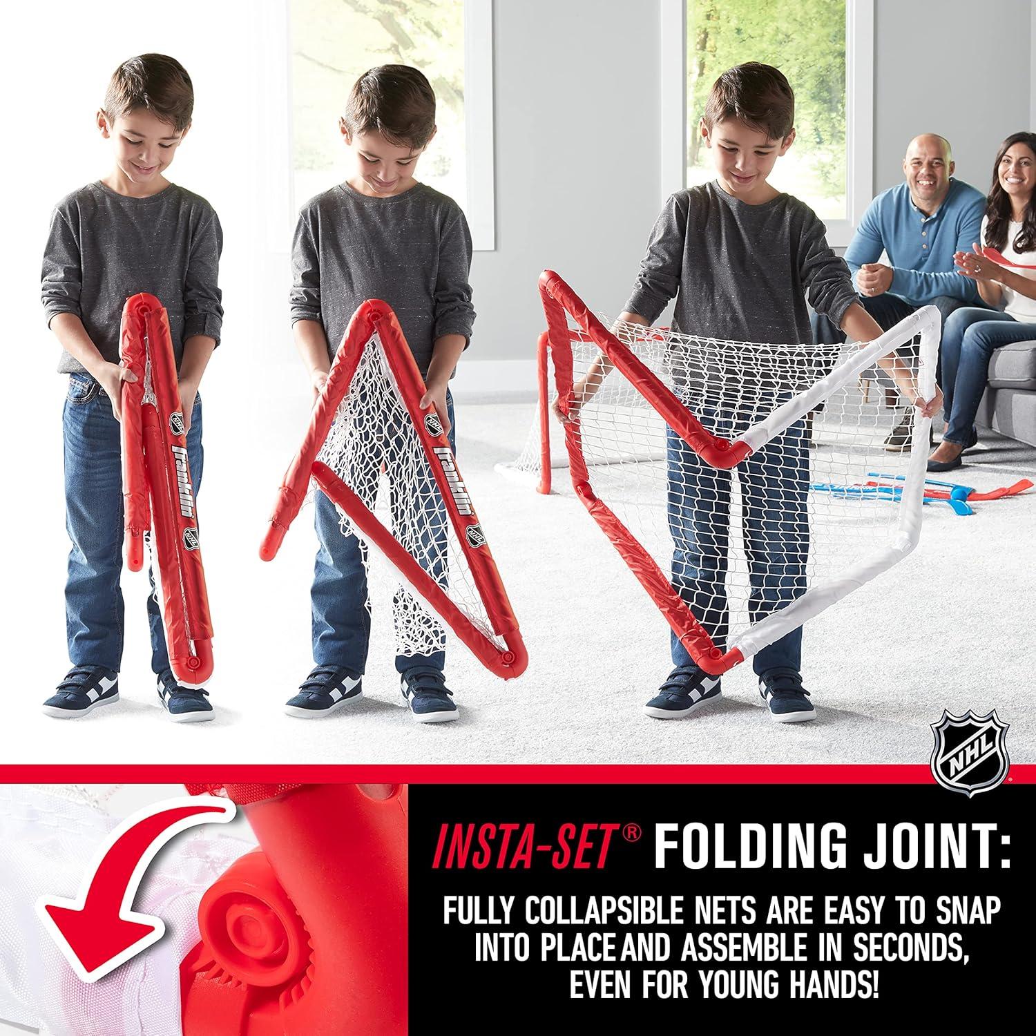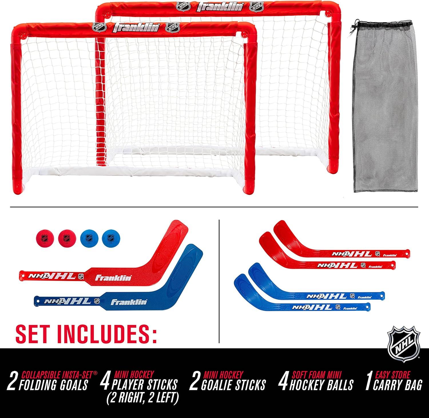 Franklin Sports NHL Kids Mini Hockey Goal Set – (2) Mini + Knee Hockey Goals, (4) Youth Sticks, (2) Goalie Sticks + (4) Foam Balls – Knee + Mini Hockey Set(Red)