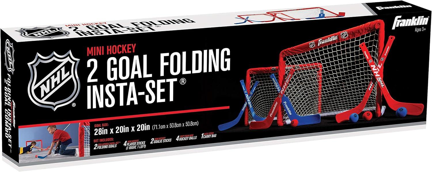 Introducing the ultimate hockey experience for your little ones the Franklin Sports NHL Kids Mini Hockey Goal Set. This awesome kids hockey set has everything your young champions need to dive into the fun world of knee hockey. With two mini hockey nets, four mini hockey sticks, 2 goalie sticks, and 4 foam balls, this knee hockey set is perfect for transforming your living room into a mini arena. This hockey set is not just about fun; it's a great way for your kids to practice their shooting and goalkeeping skills in a safe, indoor environment. This set encourages them to play on their knees, making it a fantastic solution for active play that doesn't result in broken lamps or slips. Unique features? You bet! The Franklin Sports set comes with both right and left-handed kids hockey sticks, so no one gets left out. Plus, the hockey nets are fully collapsible, making clean-up a breeze. Everything fits neatly into a slim carry bag, perfect for on-the-go fun or easy storage. And with durable plastic construction, this indoor hockey set is built to withstand all the competitive action your kids can dish out. This floor hockey set is safe and sturdy. Just set it up, and watch as your kids get lost in hours of fun with their new favorite hockey toys. Just a heads up, you’ll need to provide the excitement and cheers because this set is all about the gear. This hockey set includes 2 knee hockey nets, 4 mini hockey sticks, 2 hockey goalie sticks, and 4 foam balls.