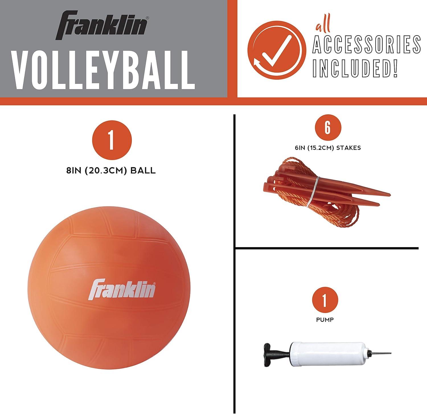 The Franklin Sports Volleyball set is a classic outdoor game that will bring hours of fun for all ages. The set includes all you need for a day of fun: (1) volleyball pole set and net, (1) volleyball and pump and (6) ground stakes and ropes. The Volleyball set is easily transportable to your next picnic, BBQ or party and is sure to be a hit. Volleyball is a timeless classic yard game that can be enjoyed by all ages. bring this set to your next gathering today!. .