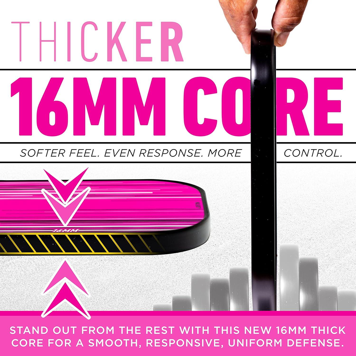 PREMIUM CONSTRUCTION: The 16mm polypropylene paddle core is built for durability and increased power while the fiberglass surface layer ensures a large sweet spot in the center of the paddle for flawless contact and increased control