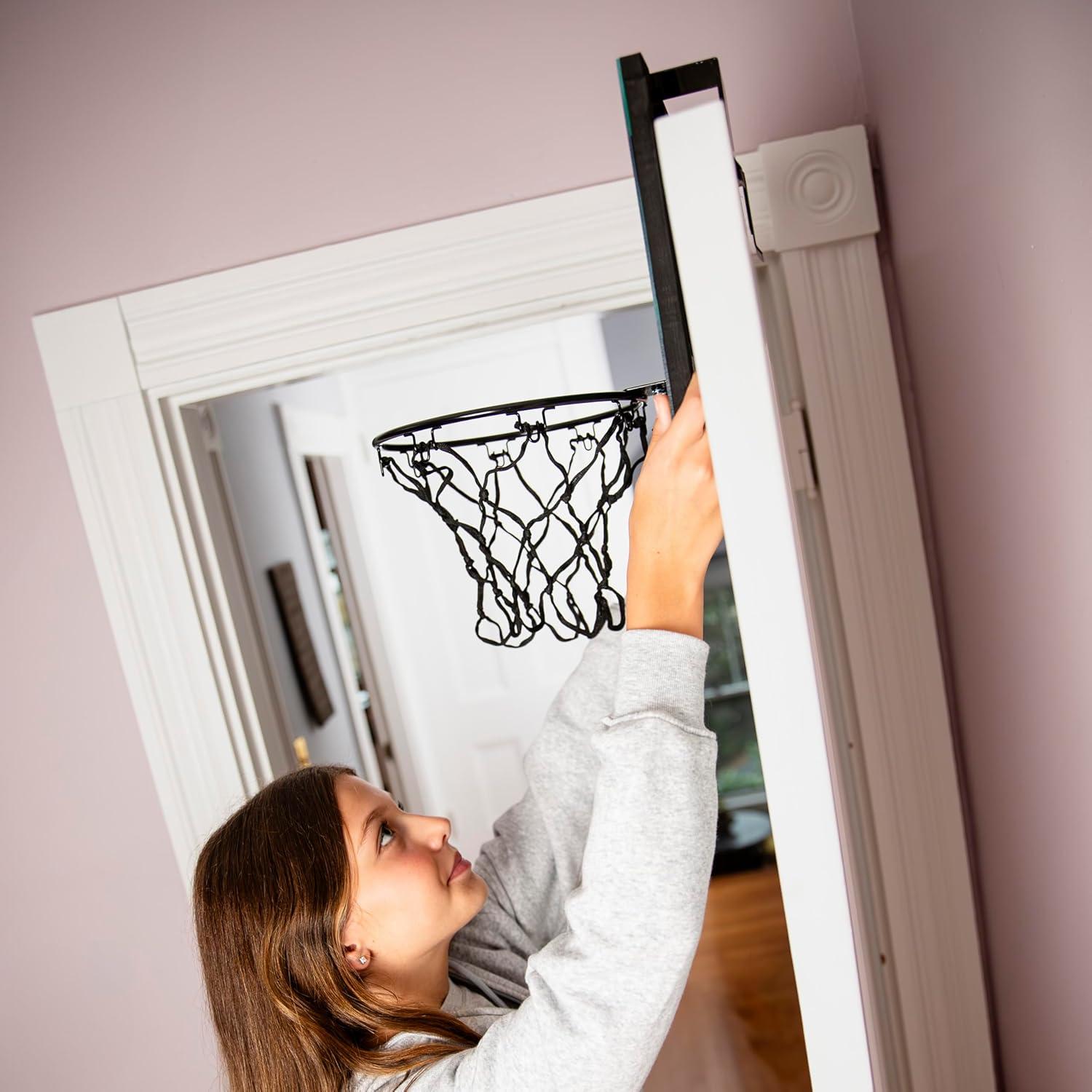 DURABLE CONSTRUCTION: Built with a shatterproof backboard and a 9.5″ spring-loaded steel rim, this over the door hoop is built to stand up to dunks and 3 pointers season after season
