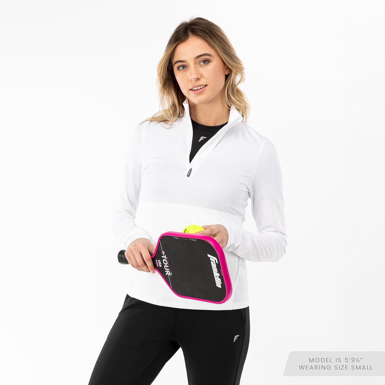 Hit the pickleball courts, golf course, yoga class, or the couch in style and comfort with Franklin Sports' Women's 1/4 Zip Pickleball Pullover Top! Perfect for getting up and moving or just getting comfortable around the house, this women's 1/4 zip pullover top from Franklin Sports is a versatile and stylish addition to any activewear collection. Designed with a breathable, moisture wicking poly spandex blend fabric, this pullover is designed to keep you dry and comfortable while exercising or relaxing. This top features a hidden front pocket to help keep your hands warm on chilly days, and built-in thumbholes on each sleeve to help keep them in place while you exercise. Plus, These shirts are designed with reflective, lay flat logos instead of classic shirt tags to minimize skin irritation and improve visibility in low light conditions. Whether you are at the pickleball courts, out on a run, doing yoga, playing golf or just relaxing, these long sleeve 1/4 zip workout tops are the perfect piece of athleisure apparel for any occasion! So grab your Franklin Sports Women's 1/4 Zip Pickleball Pullover Top and get moving today!